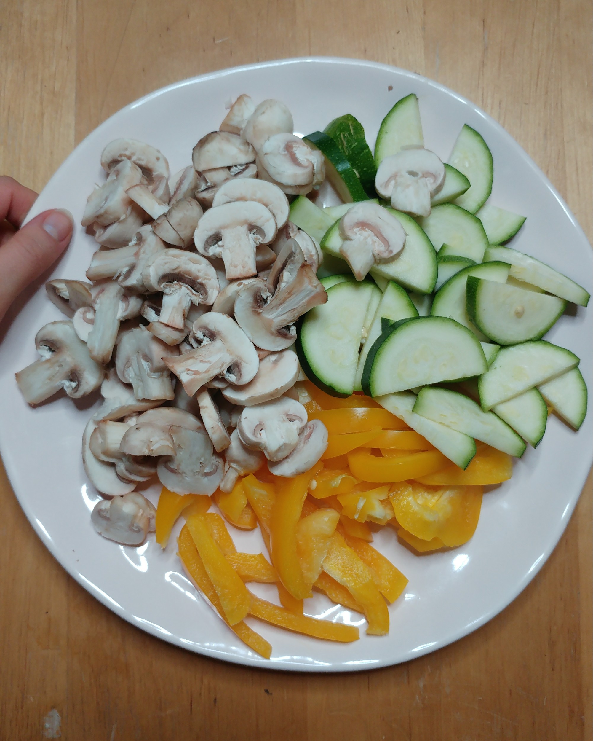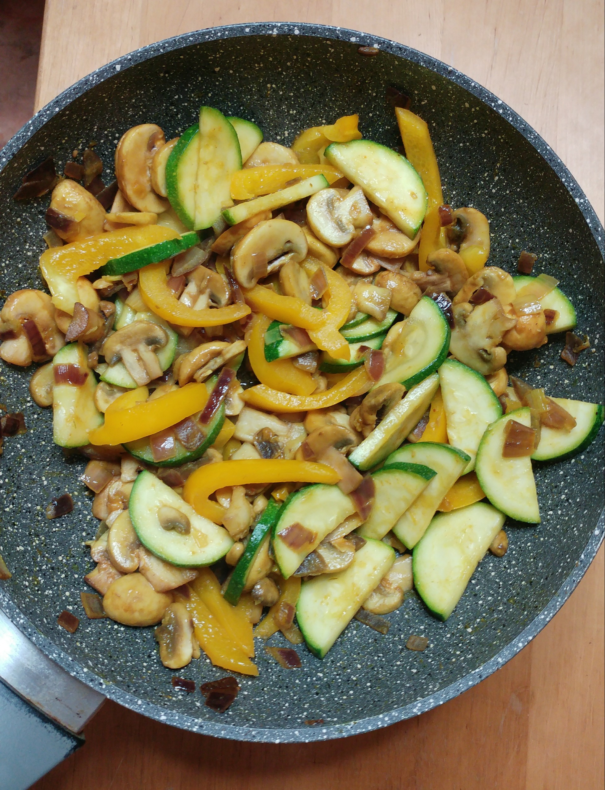 - Po chwili dodaj pokrojoną w paseczki paprykę, a po 2-3 minutach pokrojoną cukinię i pieczarki. Podsmażaj, aż do chwili gdy lekko zmiękną.