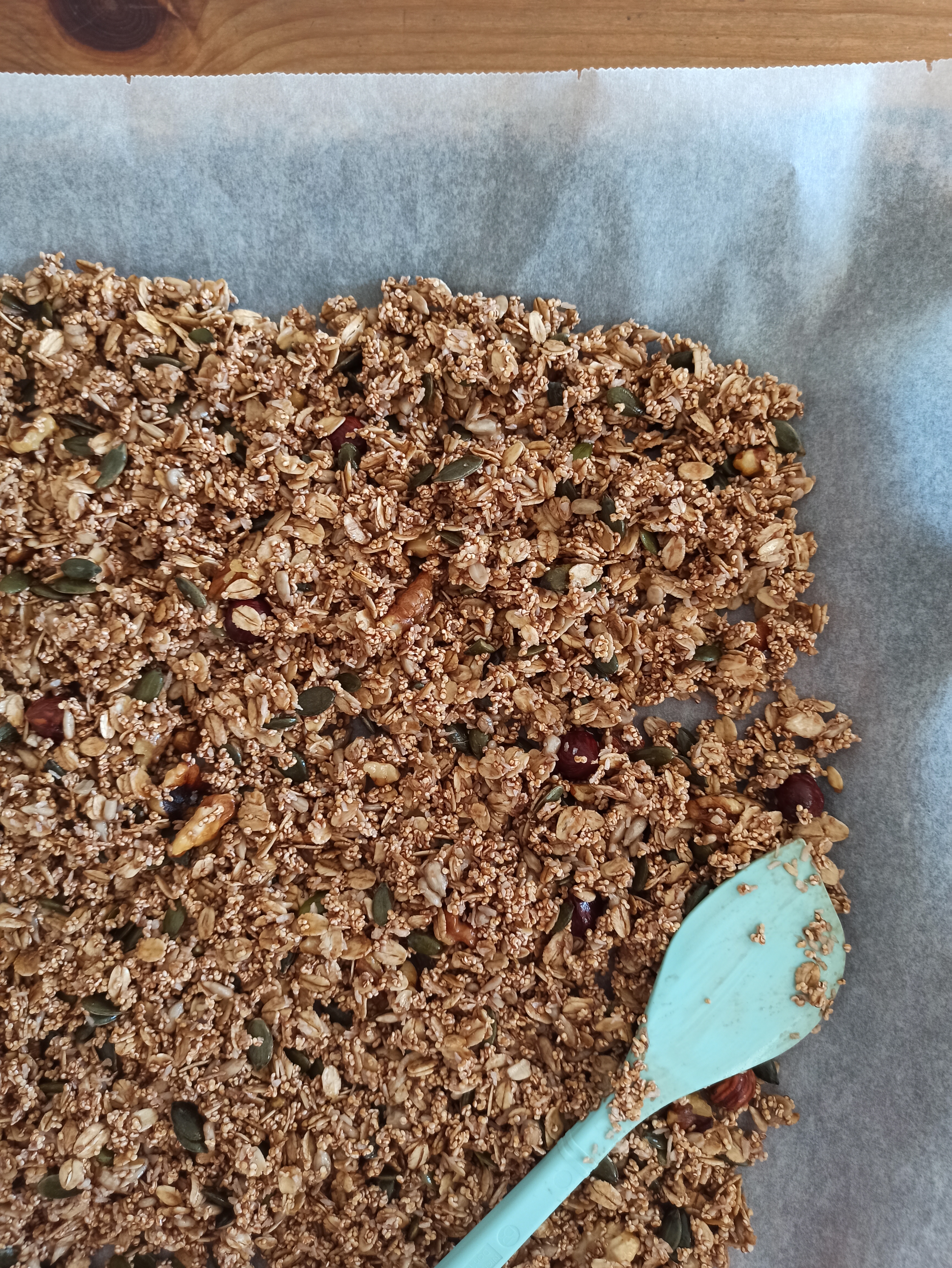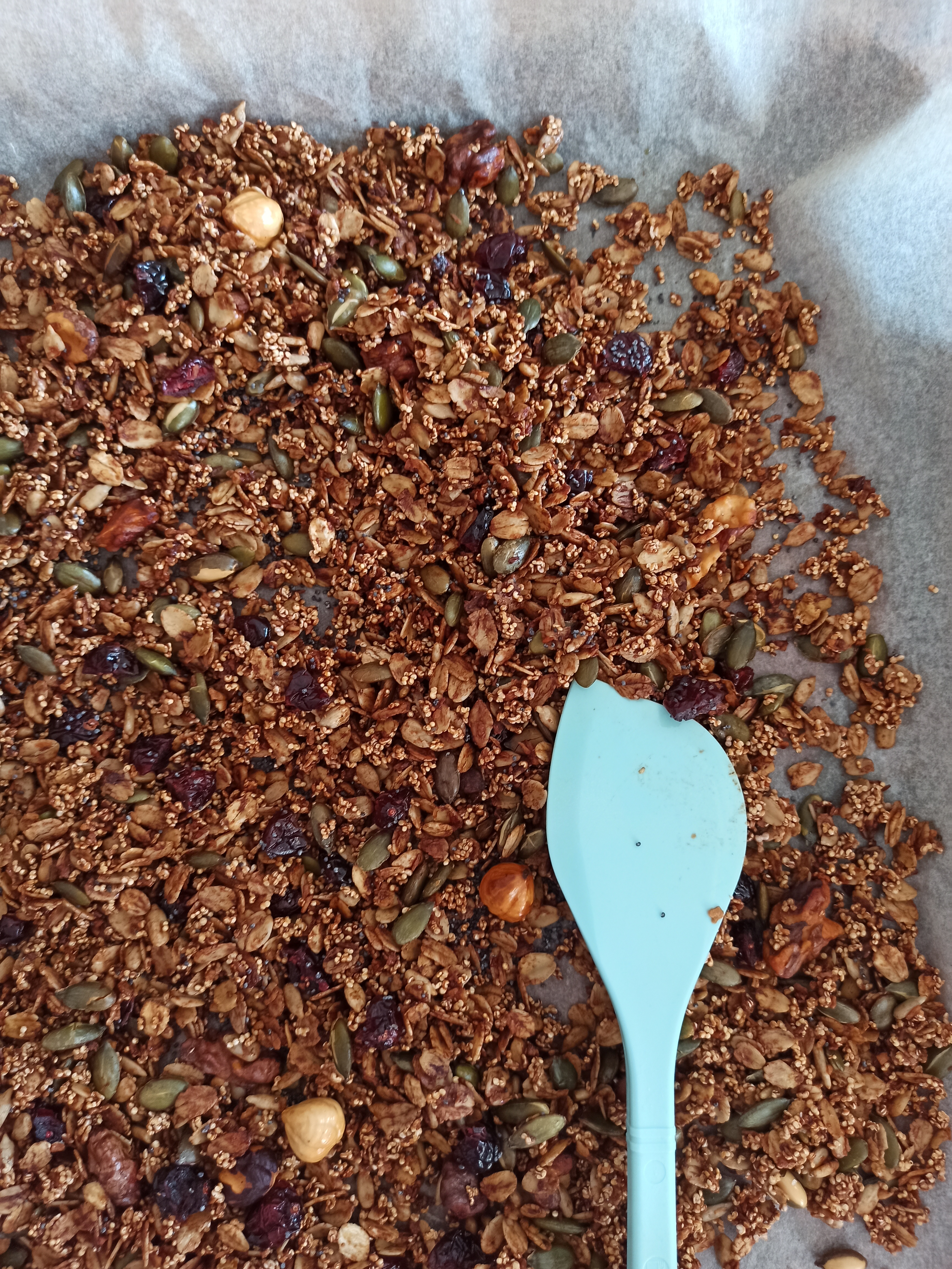 - Piekarnik nagrzej do 170 st.C, Granolę wyłóż równomiernie na blasze (na papier do pieczenia). Piecz ok. 15 minut (przemieszaj w tym czasie 2-3 razy), pod koniec pilnując czy się nie przypala. W starych piekarnikach, łatwo o przypalenie zewnętrznych części granoli. Uważaj, bo przypalona jest mało smaczna, a składników szkoda wyrzucić!