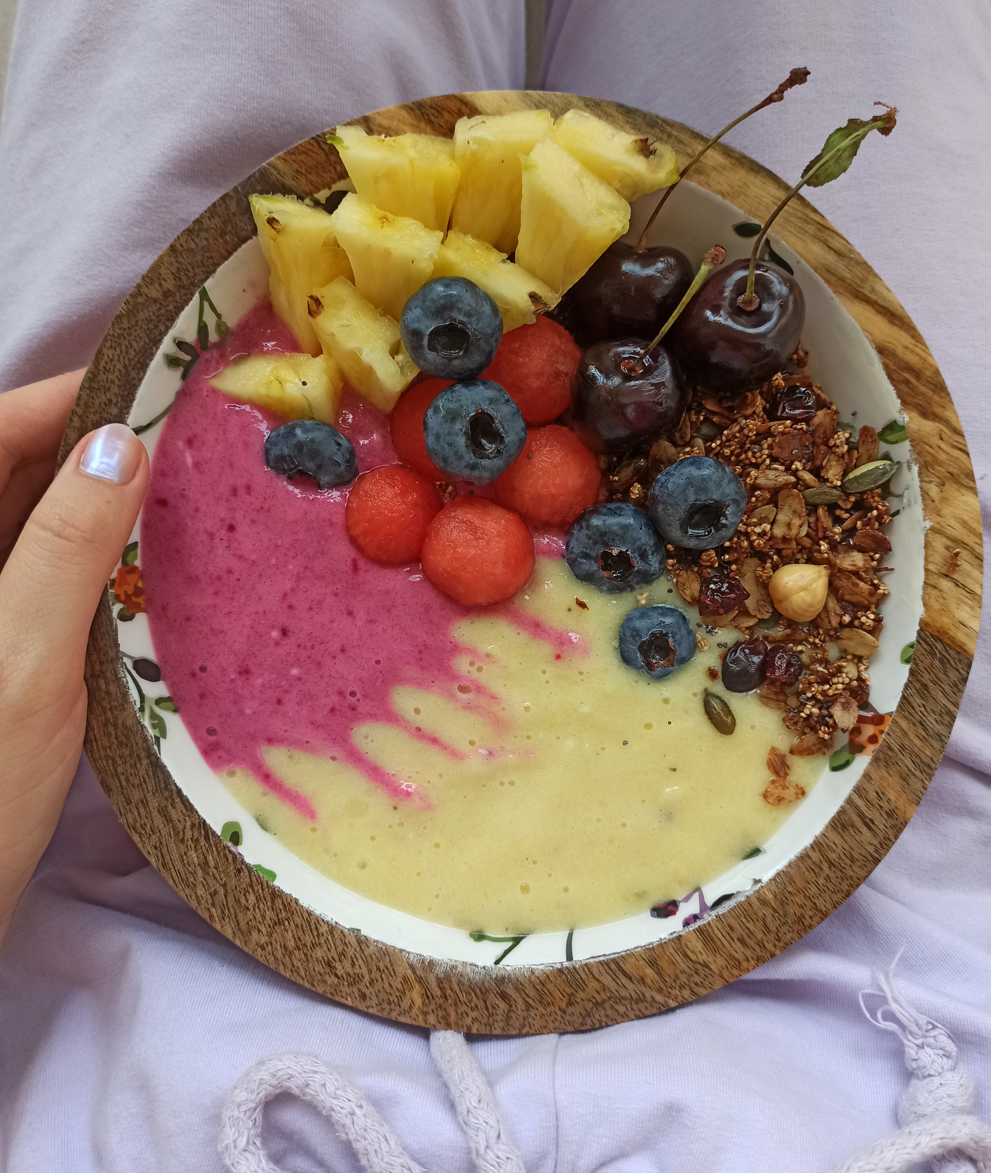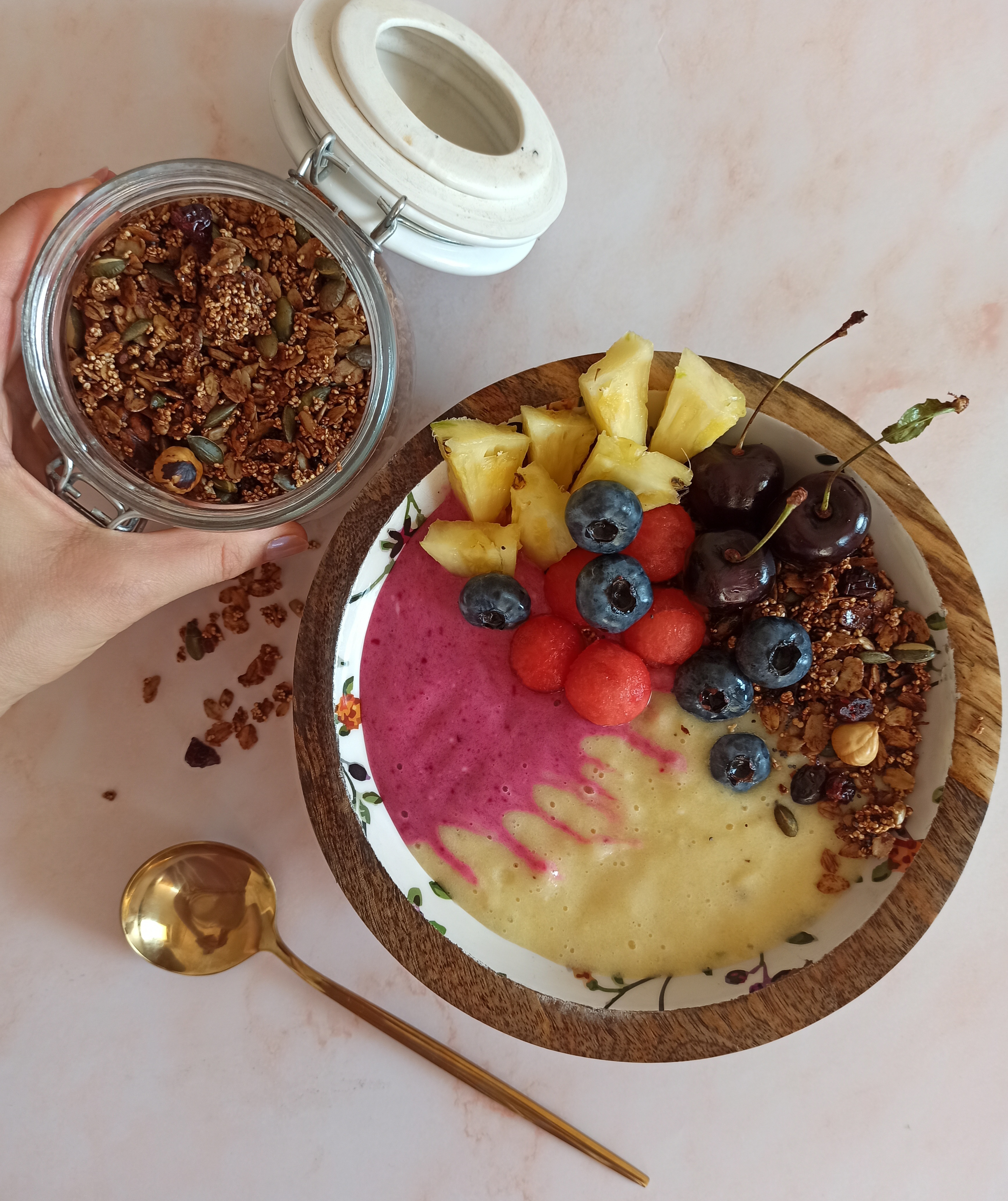 Smoothie bowl ananasowo- buraczany z domową granolą i owocami. JAk wybrać dobre płatki w sklepie.