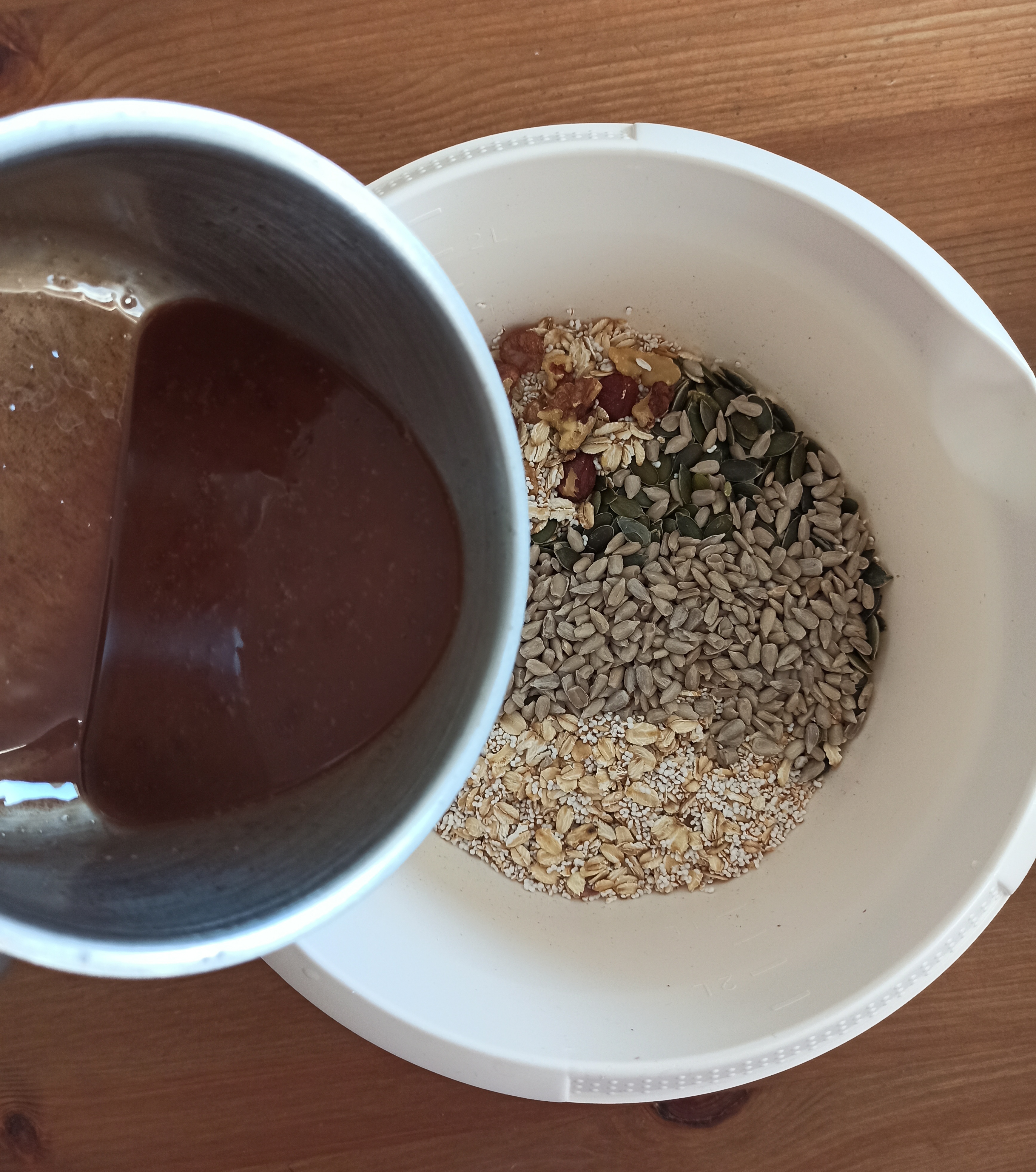 - W misce połącz płatki, amarantus, mak, nasiona i wiórki. Polej je czekoladowym syropem, dokładnie wymieszaj.