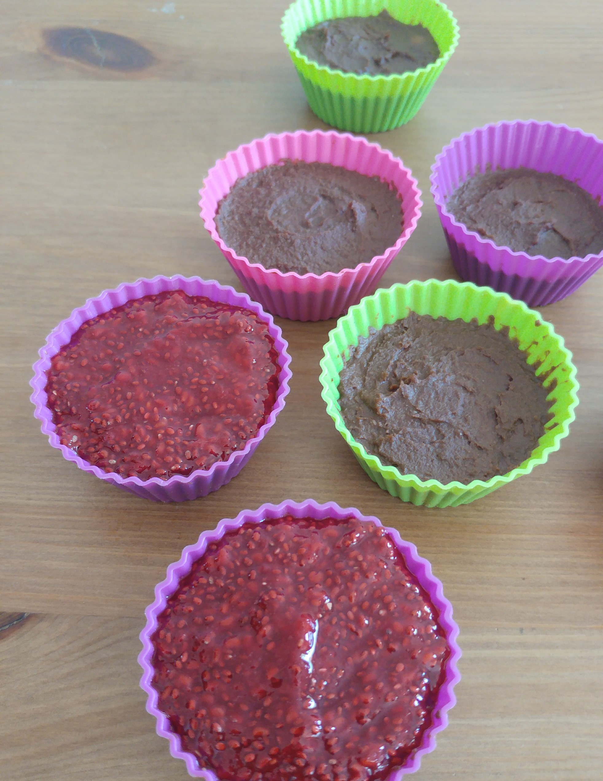 3. Maliny gotuj, aż do ich rozpadnięcia i zredukowania nadmiaru wody. Na koniec wymieszaj dokładnie trzepaczką aby otrzymać gładką konsystencję. Do jeszcze ciepłych malin dodaj nasiona chia i słodzidło. Dokładnie wymieszaj i odstaw na co najmniej 30 minut (aby nasiona mogły częściowo napęcznieć). Po tym czasie wypełnij pozostałą część foremki prawie do końca.