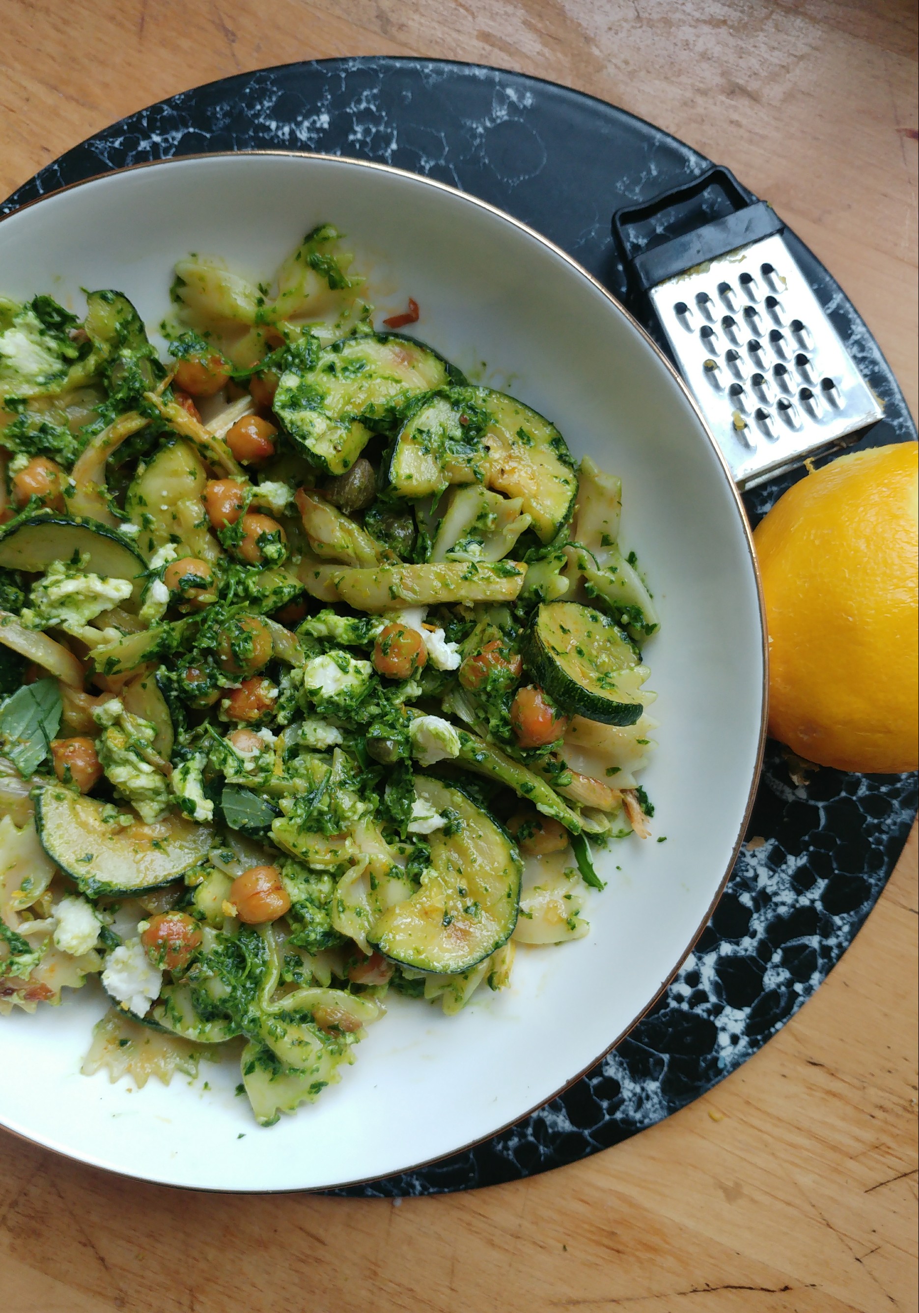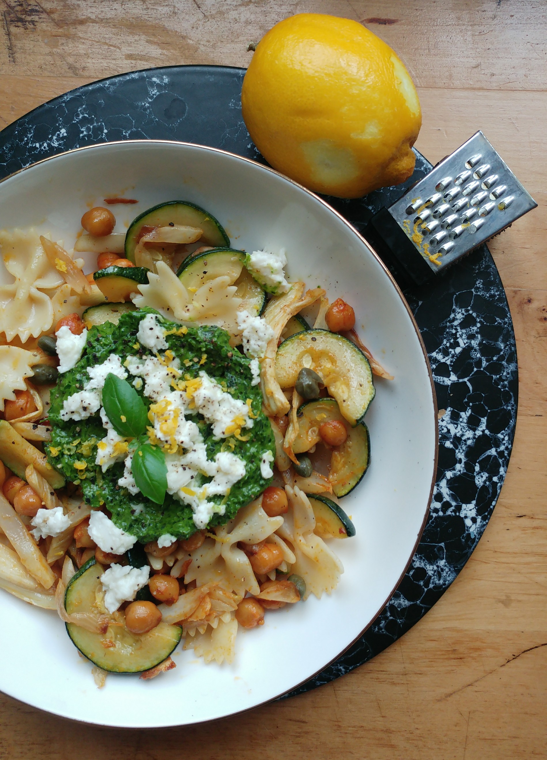 5. Makaron wymieszaj z sosem, dodaj podsmażone warzywa (razem z sokami), rozdrobnioną mozzarellę, kapary, ciecierzycę, kilka porwanych listków bazylii i skórkę z cytryny. Delikatnie przemieszaj. Dopraw solą i pieprzem według uznania.